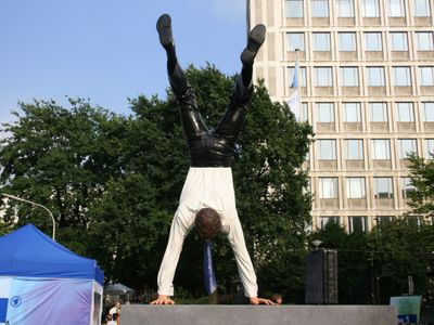 The sculpture displays a young businessman performing a handstand while wearing a white shirt, black pants, and holding a briefcase on a concrete pedestal.