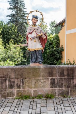 Figur des heiligen Johann Nepomuk, bemalte Steinfigur auf der Brüstung der Gänsbachbrücke, darunter Inschriftstein, Mitte 18. Jahrhundert, Inschriftstein bezeichnet „1843“