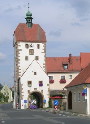 Vogelturm, mehrgeschossiger Torturm aus verputztem Bruchsteinmauerwerk, mit Halbwalmdach, Zwiebeldachreiter und Eckquadern, 1466, Torwappenschild bezeichnet mit „1727“, südwestlicher, zweigeschossiger Vorbau mit Satteldach bezeichnet mit „1568“