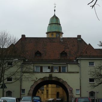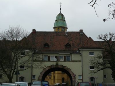 Wohnblock der Eisenbahnersiedlung Rangierbahnhof, dreiflügelanlage, bestehend aus zwei- und dreigeschossigen Walmdachbauten mit mittiger Tordurchfahrt und eingestellten Ecktreppentürmen, in barockisierenden Formen, bezeichnet „1913“