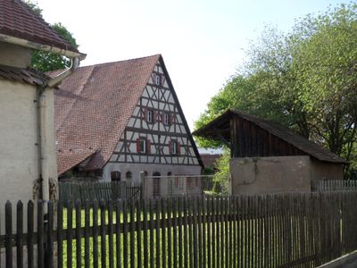 Spitalhof 3a-3b, Bauernhaus, erdgeschossiger, traufständiger Sandsteinquaderbau mit Satteldach und Fachwerkgiebel an Ostseite, im Kern 18. Jahrhundert