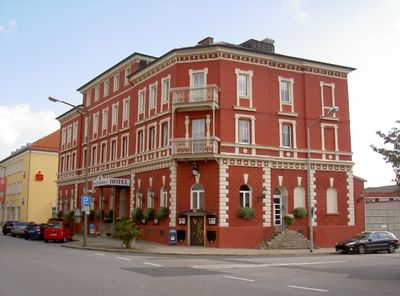 Hotel Hohen Bogen, dreigeschossiger Flachwalmdachbau in Ecklage mit höherem Mittelteil, Putzgliederungen und Eisenbalkon, spätklassizistisch, um 1880 von Franz Holm