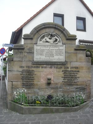 Kriegerdenkmal, kriegerdenkmal für 1914/18 und 1939/45, Sandsteinaufbau mit halbrundem Giebel und Relief eines gefallenen Kriegers, davor Eisengeländer, 1923