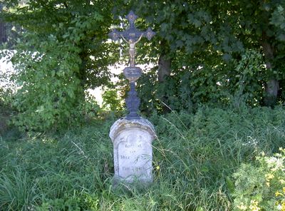 Wegkreuz, gusseisenkruzifix auf Granitsockel mit Blendmaßwerk, Ende 19. Jahrhundert