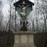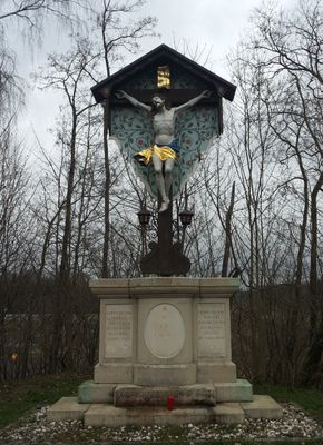 Grubenkreuz, gefasstes Holzkruzifix über breit gelagertem Kunststeinsockel mit Inschriftentafeln, 1922/1923; südlich von Wackersdorf auf hainartigem Gelände der Bayerischen Braunkohlen-Industrie