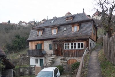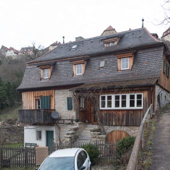Weinsteige 12, zweigeschossiger Bruchsteinbau mit Mansarddach mit Halbwalm, im Kern 14./15. Jahrhundert, Umbau und Verlängerung zum Wohnhaus um 1900