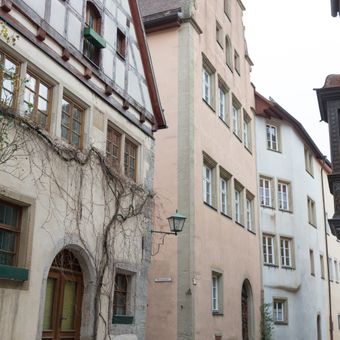 Kirchgasse 2, dreigeschossiger Giebelbau mit steilem Satteldach und abgetrepptem Giebel mit Obelisken, Fachwerkinnenhof mit sechseckigem Treppenturm, verputzter Massivbau, vor 1500; mit Ausstattung