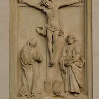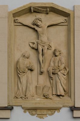 Schellenbergerstraße 1, sandsteinrelief mit Kreuzgruppe, bezeichnet „1484“, wohl um 1600 nachgebildet; in der Hauswand