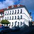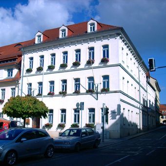 Rathaus in Ecklage einschließlich links angrenzendem Bau, bezeichnet im Schlussstein. Ornamentale Deckenmalerei von ca. 1840 , Ausstattung von ca. 1910, Ratssaal mit Bleiglasfenstern, Sitz der Stadtverwaltung. Am Markt 1, church building in Pulsnitz, Germany