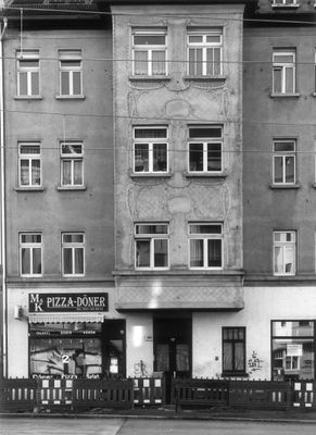 Mietshaus Georg-Schumann-Straße 189, Mietshaus in geschlossener Bebauung; mit Läden, Putzfassade, Treppenhausfenster mit Bleiglas