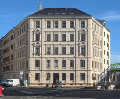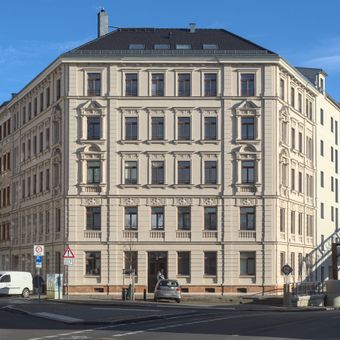 Multiple dwelling Herrnhuter Straße 2, Mietshaus in geschlossener Bebauung in Ecklage Zweinaundorfer Straße mit Tordurchfahrt und Läden (Putzfassade; Reste von Ausmalung und Stuckgliederung im Eingangsbereich); städtebaulich unverzichtbarer Kopfbau