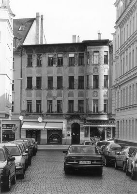Mietshaus Zweinaundorfer Straße 3, Mietshaus in geschlossener Bebauung mit Läden (Putzfassade; Stuckgliederung im Eingangsbereich)
