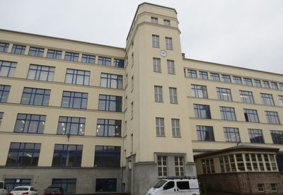 Fabrikanlage mit großem Werksgebäude und mehreren Anbauten (Kesselhaus und Schornstein vor 2009 abgebrochen) – ehemaliges Rundfunk- und Fernmelde-Technik Uhlestraße 34