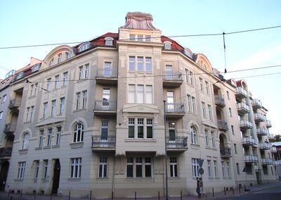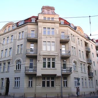 Mietshaus vom Typus in geschlossener Bebauung, Eckhaus Biesnitzer Straße 10, Repräsentative und baukünstlerisch qualitätvolle Fassade, baugeschichtlich, städtebaulich und straßenbildprägend von Bedeutung; nach 2014 von der Denkmalliste gestrichen