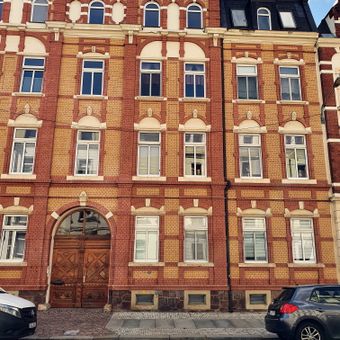 Friedrichstraße 6, Mietshaus in geschlossener Bebauung, baugeschichtlich von Bedeutung, qualitätvoll gegliederte Klinkerfassade in gutem Originalzustand, 3-geschossig, Wechsel von gelbem und rotem Klinker, neue Fenster, originale Tür