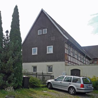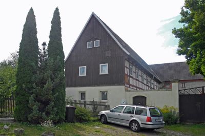 Wohnstallhaus, Seitengebäude und Scheune eines Dreiseithofes Zur Laue 2, house in Bannewitz, Germany