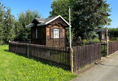 Sogenannte Simonsche Laube, Gartenlaube in der Kleingartensparte „Am Klinkborn“ Amselweg 1, Holzkonstruktion auf kleinen Pfeilern, eine der ersten Lauben des Gartenvereins. Holz auf kleinen Steinpfeilern, da die Anlage im Überschwemmungsgebiet liegt. Anlage 1922 gegründet, ab Herbst Parzellierung, original auch Fenster, Tür mit originale