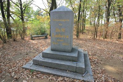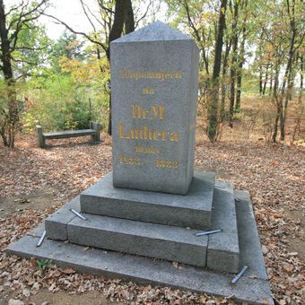 Lutherdenkmal Niedergurig, Bezeichnet mit „10. Nov. 1483–1883“, sorbische Inschriften: „K dopomnjeću na Dr. M. Luthera. // Dar Hórčanow. // Jedn twjerdy hród je naš Bóh sam. // Česć budź Bohu!“ [deutsch: „Zur Erinnerung an Dr. M. Luther. // Ein Geschenk de