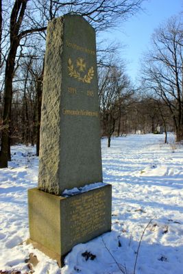 Gefallenendenkmal Niedergurig, Ortsgeschichtlich von Bedeutung, Inschriften: „Den braven Helden 1914–1918 - Gemeinde Niedergurig“ (Vorderseite), „Dźak Wam! Měr nam!“ (Rückseite)