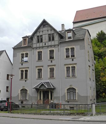 Mietshaus Dresdner Straße 2, u.a. baugeschichtliche Bedeutung, dreigeschossiger Kubus mit profilierten Gewänden, flacher Mittelrisalit, hölzerne Eingangsbedachung, Zierfachwerk am Dacherker, Krüppelwalmdach