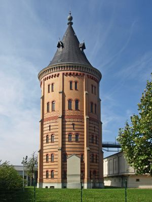 Wasserturm und Wasserversorgungsanlage, Wasserturm und Wasserhochbehälter; Wasserturm gelber Klinker mit Muster, gebaut unter Magistratsrat Reichert, Wasserbehälter aus Stahlbeton, zweigeschossig, mit großem quadratischem Grundriss, expressionistische Architektur, baugeschichtlich und t