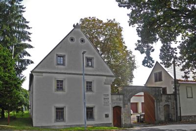 Wohnstallhaus und Torbogen eines Bauernhofes Eutschützer Straße 1