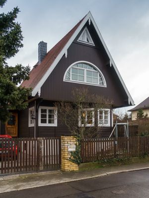 Ludwig-van-Beethoven-Straße 3, rustikales, villenartiges Holzhaus mit hohem Satteldach und Ziergiebel, baugeschichtliche Bedeutung Holzbauweise im Landhausstil, eingeschossig, steiles vorkragendes Satteldach, Schaugiebel mit Zierbrettern und großem, mehrteiligem, halbrundem Fenst