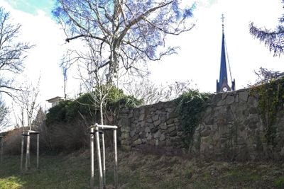 Sachgesamtheit Stadtbefestigung Wilsdruff: Reste der historischen Stadtmauer von Wilsdruff im Bereich Töpfergasse (Rekonstruktion frühes 20. Jh.), Gezinge und Stadtgraben (alles Einzeldenkmale, siehe auch Einzeldenkmaldokument - Obj. 08964307, glei