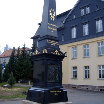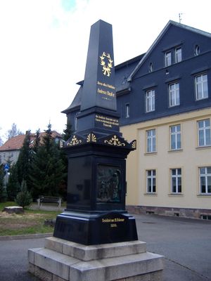 Denkmal für Andreas Hupfer Hauptstraße 1, ortsgeschichtlich von Bedeutung, Granitstele mit Reliefs, gewidmet dem Bürger des Ortes und wohltätigen Stifter Andreas Hupfer (1721–1799). geb. 1721, gest. 1799, errichtet am 19. Februar 1899, Inschrift: „Die dankbare Gemeinde und die Feuerver