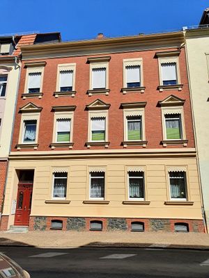 August-Bebel-Straße 26, Mietshaus in Wurzen, geschlossene Bebauung, baugeschichtlich und städtebaulich von Bedeutung, gründerzeitlicher Putz-Klinkerbau. Putzstreifen im Erdgeschoss, Fensterrahmung in Putz mit Dreiecksgiebelbedachung