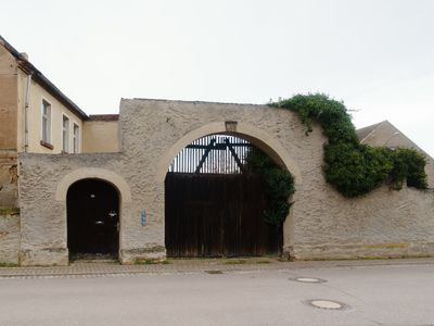 Toranlage eines ehemaligen Dreiseithofes Dorfstraße 23, Einzige historisch bedeutende Toranlageim Ort, straßenbildprägend, baugeschichtlich von Bedeutung. Tor mit Leutepforte (Korbbogen) massiv und verputzt (Putz erneuert), Schlussstein (Sandstein mit Inschrift C.G. [Name unleserlich] 1820 oder 1826, N