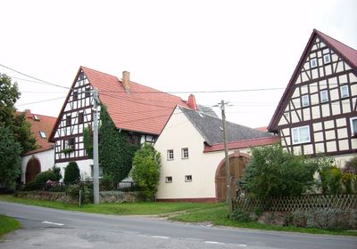 Wohnstallhaus, Seitengebäude und Scheune eines Dreiseithofes sowie Torbogen mit Pforte Alte Straße 7, house in Lunzenau, Germany