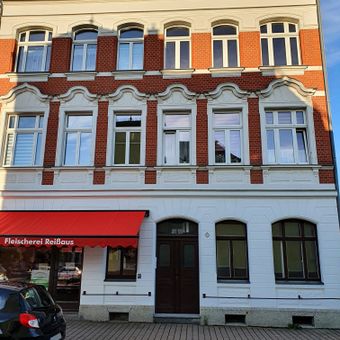 Markt 8, Mietshaus vom Typus in geschlossener Bebauung, typische Klinkerfassade der Zeit um 1900, schönes Zeugnis gründerzeitlichen Bauens am Markt, architekturhistorisch relevant dreigeschossig, Mansarddach (Biberschwanzdeckung), Klinkermischbauweise