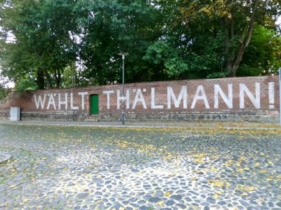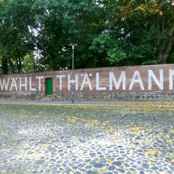 Jakob-Böhme-Straße 1, Ehemals Königliche Bank, später Reichsbank, Einfriedung aus Ziegelmauerwerk mit Inschrift „Wählt Thälmann“ als Kulisse eines DEFA-Films, baugeschichtlich und ortsgeschichtlich von Bedeutung. Hieß früher wohl Oberthorstraße 1. Wohl ursprün