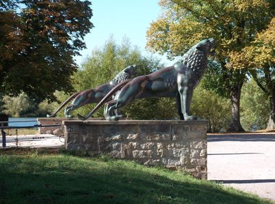 The platform was constructed in 1934 during the development of Lake Maschsee, with two lion sculptures by Arno Breker installed in 1938 based on the Brunswick Lion.