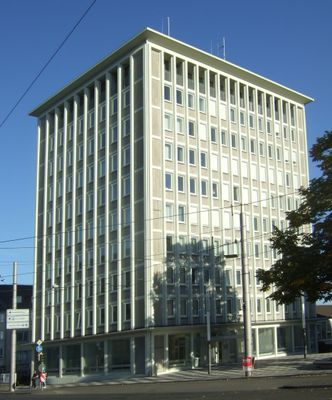 Between 1954 and 1956, architect Werner Seidel designed this office building as the headquarters for the regional energy company Elektrizitäts-Aktiengesellschaft Mitteldeutschland.