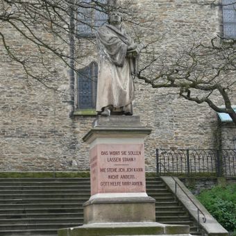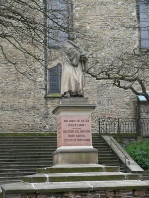 Lutherdenkmal, Figur des Reformators auf abgestuftem Sockel und Postament, kunsthistorisch bedeutsam Das 1883 geschaffene Lutherdenkmal zeigt den Reformator als Einzelfigur auf einem hohen Postament mit einem großflächigen, abgestuften Sockel. Der Dresdner Bildh