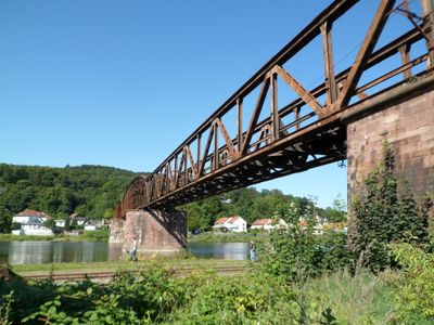 The Weserbrücke railway bridge crosses the Weser River, connecting both sides of Hamelin with double tracks for regional train transportation.
