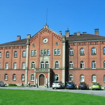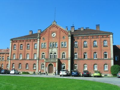 The Ehemalige Kreisirrenanstalt features a multi-wing design around courtyards with ornamental stone details and decorative brick patterns across its two to three stories.