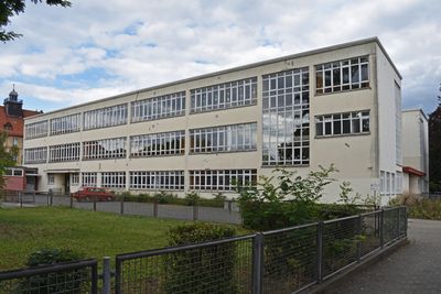 The Altstädter Schule features horizontal window rows across its facade, incorporating glass-enclosed stairwells and three floors with two side wings.