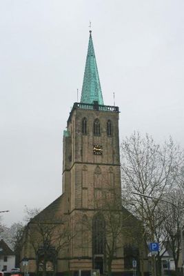 The St. Remigius church stands in central Viersen with a light-colored facade and features stained glass windows that illuminate its interior spaces.