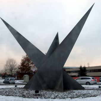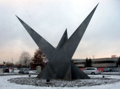 The sculpture represents the Dreiländereck through its three-pointed design, marking the intersection where multiple roads meet in the industrial district.