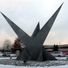 The Dreispitz sculpture features three metal spikes, each measuring eight meters in length, emerging from a circular gravel bed at a roundabout.