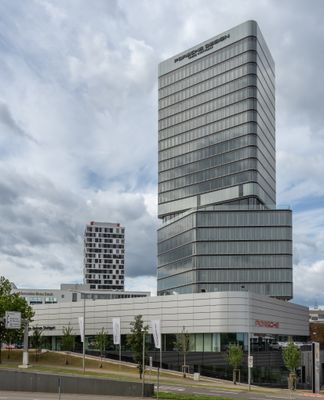 The structure incorporates horizontal architectural elements that mirror the adjacent Porsche Center, creating a unified visual presence in the northern Stuttgart skyline.