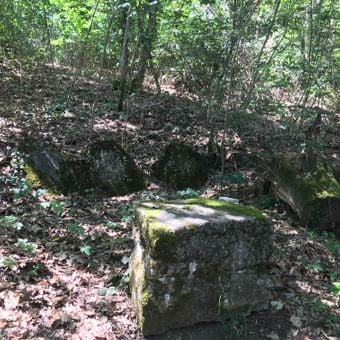 The Friedenssteine is a group of four limestone blocks arranged in an arc formation along a steep slope near Ilskeweg. They sit perched on the hillside with views toward Fränkenau village below.