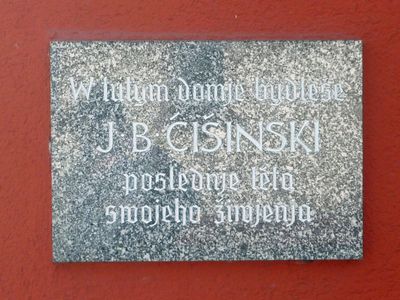Gedenktafel für Jakub Bart-Ćišinski an seinem Wohnhaus, steinerne Tafel mit sorbischer Inschrift an der Fassade