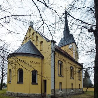 Kirche (mit Ausstattung) und Kriegerdenkmal für die Gefallenen des Ersten Weltkrieges und Kriegerdenkmal für die Gefallenen des Zweiten Weltkrieges auf dem Kirchhof Carsdorfer Straße -