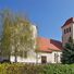 The St. Albanus Church stands on Käthe-Kollwitz-Straße in Schkeuditz, featuring a tall spire that was added during the 1899 renovation project.