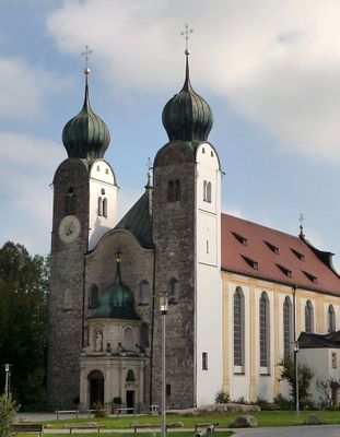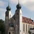 The Klosterkirche St. Margarethen features two massive towers with baroque domes and stands on a forested steep slope overlooking the Traun and Alz valleys.