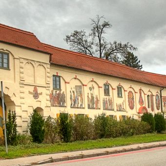The chapel, consecrated in 1599, contains religious furnishings from 1500, while Karl Sonner created wall paintings in the blind arcades during 1924.